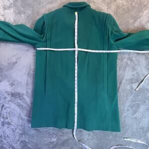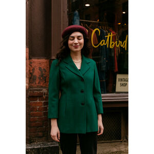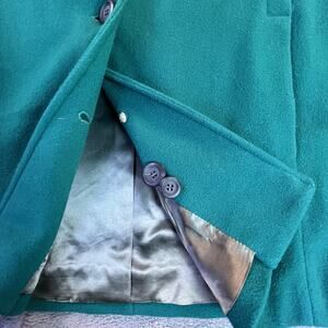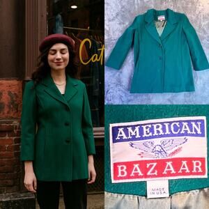Timeless American Bazaar women’s coat crafted from pure wool in a rich teal green tone. This vintage 1980s–1990s piece features a structured silhouette, notched lapel, and three-button front (bottom button missing but not noticeable when worn). Fully lined and made in the USA, showcasing the era’s classic tailoring and quality craftsmanship.