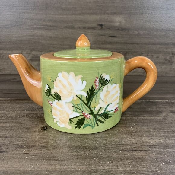 Vintage Teapot Hand Painted Flowers Ceramic Teapot Designpac Green 4 Inch