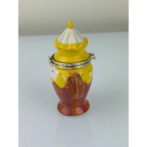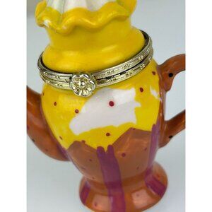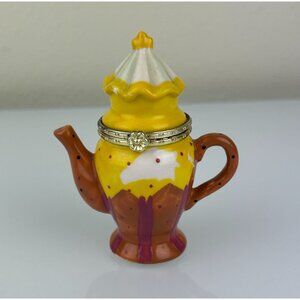Vintage Teapot Shaped Hinged Trinket Box Yellow Brown Polka Dots Flaws READ