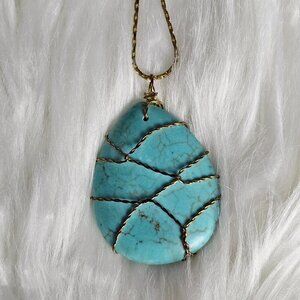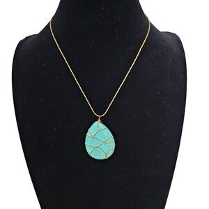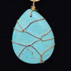 Tear drop turquoise color pendant wrapped in gold tone twisted wire