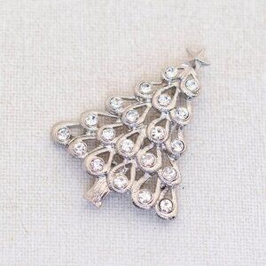A vintage silver tone brooch that resembles a Christmas tree with rhinestones by Monet.