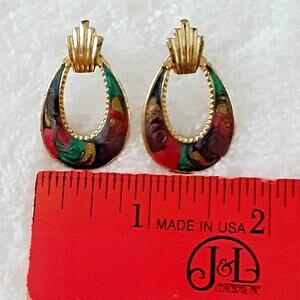 Vintage teardrop hoop earrings with dreamy enamel swirls in purple, pink, green & gold ✨ Gold-tone finish with a bold retro vibe. Lightweight and perfect for everyday sparkle, festival flair, or party glam. Pre-owned with visible vintage wear. Approx. 1 1/4" length x 3/4" width.