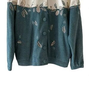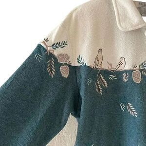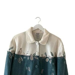 Vintage Teddi Cabin Fever Women's Fleece Novelty Print Teal Embroidered Birds Mom Nana SZ L