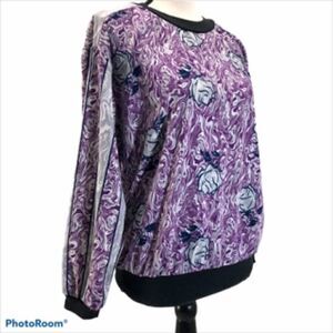 Long sleeved round neck pullover with grey and purple floral designs. Size L EUC.