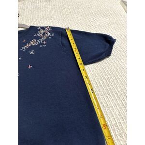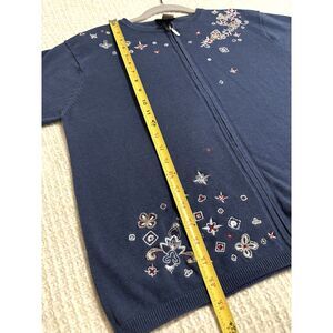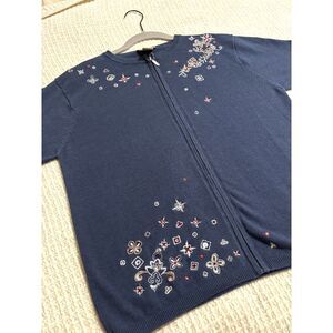 Pretty Teddi embroidered knit zip-front cardigan in a deep navy blue with floral and starburst stitching in red, white, and silver. Soft, lightweight cotton-ramie blend with short sleeves and a classic crew neckline. Perfect for layering across seasons.