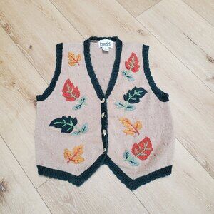 Vintage Teddi Fall Leaf Sweater Vest Cottagecore Button Embroidered Grandma Sz S