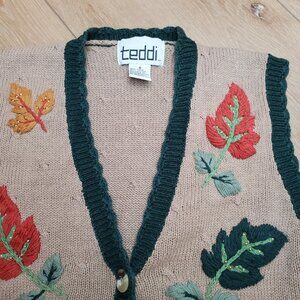 Vintage Teddi Fall Leaf Sweater Vest Cottagecore Button Embroidered Grandma Size S