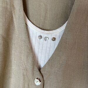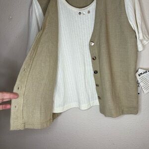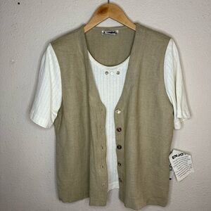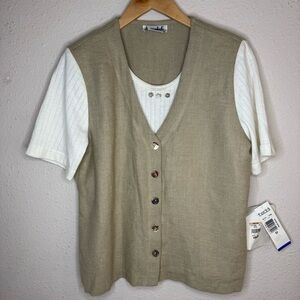 Vintage Teddi Mock Vest Top Blouse Tan & White Short Sleeve 80s Women’s Size Med
