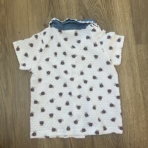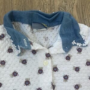 The sweetest button up 2T vintage top. Poly cotton blend with teddy Bears holding hearts. Denim collar with floral lace trim. Shirt has a textured design that brings an even sweeter vintage element and feel. In excellent condition. No flaws or stains. Made in the USA.