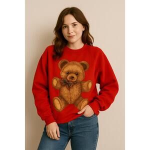 Vintage 90s Teddy Bear Sweatshirt Adult Large Red Pullover Granny Mom Fruit of the Loom