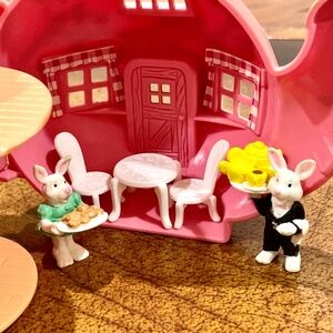 Includes: Waiter Bunny, Waitress Bunny, Tray with Tea Set, Tray with Biscuits, White Dining Set, and Cafe Sign