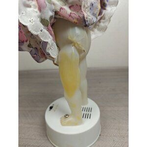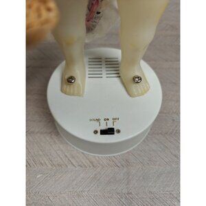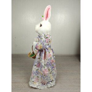Charming vintage Easter bunny figure with motion and sound features. Dressed in a floral dress, holding a decorative basket. Battery-powered. Tested, works. One leg is a bit damaged, not visible under the dress, doesn't affect function.