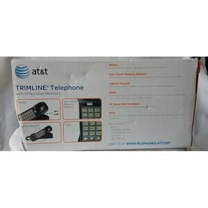 The Vintage Telephone AT&T Trimline 210 in Black is a corded telephone manufactured by VTech in the year 2000. This unit features a single phone line and handset, with a trimline style design. It comes in its original box and has been tested to be in working condition. The phone is a classic black color and is a unit made in China. It does not include a manufacturer warranty and is a standalone unit without any additional custom bundles.