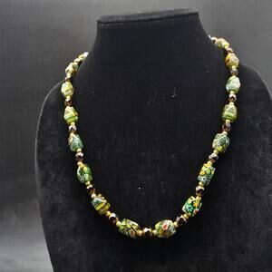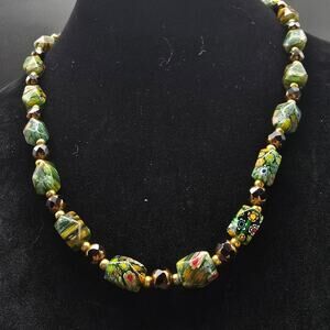 Vintage Teng Yue Green Millefiori Glass Beaded Necklace Floral