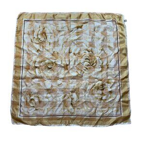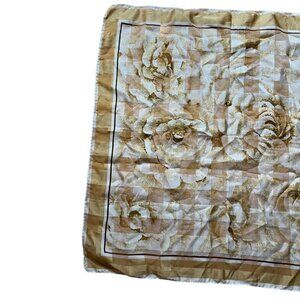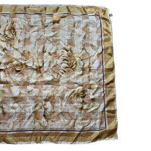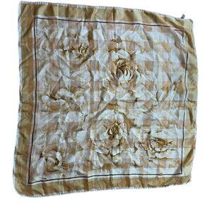 Vintage tan and brown scarf in a floral rose pattern. The scarf is polyester and was made in Italy. Please take a look at all of the photos as there are spots where the fabric is separated. The scarf is approximately 33 x 33" and is marked Valentina.