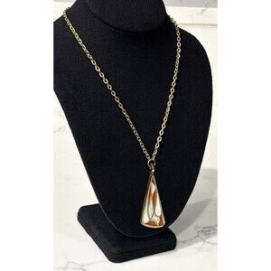 Vintage Terra Sancta Guild pendant necklace, dated 1969, handcrafted in Israel. Features a stylized white enamel dove in a modernist stained-glass style on a gold-tone triangular pendant. Signed on the back: Terra Sancta Guild 1969 Israel. A collectible piece of mid-century enamel art jewelry.