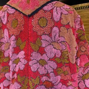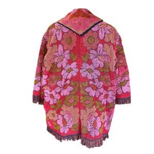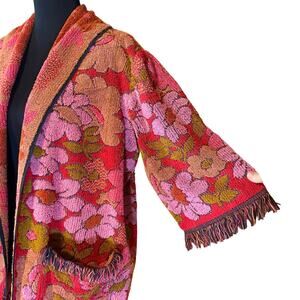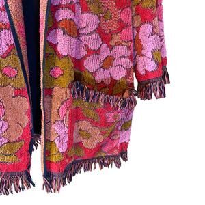One-of-a-kind vintage terry cloth cardigan that’s a true boho hippie dream! Features a vibrant floral tapestry pattern in pink, red, and olive tones with fringe trim along the hem, sleeves, and pockets. Open-front design with roomy front pockets.