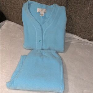 Gently Loved Supet Qualitu Terry Cloth 2pc Lounge Set by Karen Neuburger Cozy light blue in color… **Please Note Top is missing 3 Buttons, that dies not hinder its wear in any way and can be replaced ** Thus has been washed and ready to wear!