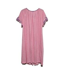 Contrast purple tie at the neckline and sleeve appliques. One pocket hidden at the right side seam. Knee length. Super cute as a swim cover up !