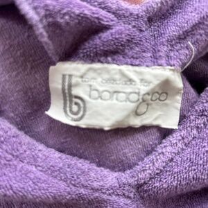 Made in the USA Vintage Purple TerryCloth Jumpsuit, Brand: Tom Bezduda for Brad & co.. Short sleeves with fringe. Elastic Waistline, cozy chic beach or swimming pool cover-up. Pretty good condition for vintage. cool girl standout. Tag says petite but fits like size S. 80% cotton 20%polyester