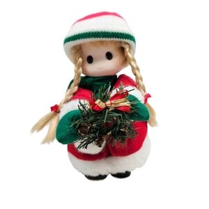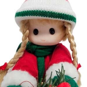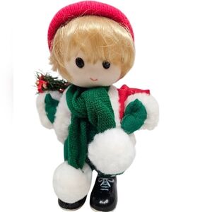 Features vintage 90s Terry's Village set of wind-up musical Christmas dolls, back wind up mechanism, girl and boy set, instrumental Jingle Bells and heads move, both are dressed in festive outdoor Christmas gear with scarves and holding wreaths.