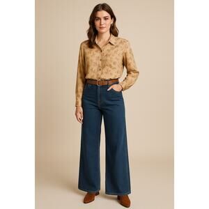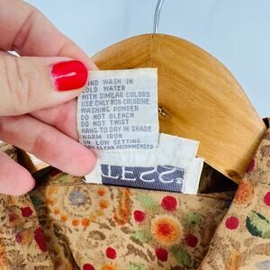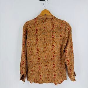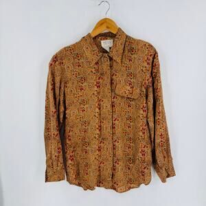 Vintage Tess 100% Silk Tan Floral Button Down Blouse Shoulder Pads Size S