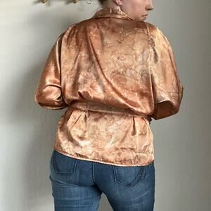 Vintage Tess Orange Satin Fitted Blouse - Vintage Size 8, runs small, see measurements for best fit - faint abstract floral pattern - fitted through waist - excellent vintage condition but it is missing 1 button from one of the sleeves, see last pic