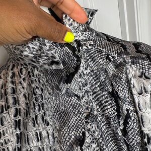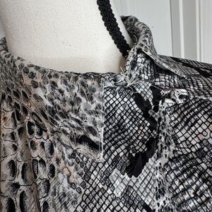 Vintage Tess Reptile Print Asymmetrical Button Down Blouse, Sz 12 is in excellent preowned condition. This blouse is gorgeous with great details. There are also shoulder pads (that can stay or be removed).