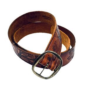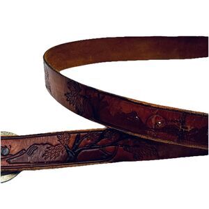 Vintage Tex Tan Belt size 40 Hand Tooled Leather Sunset Trees Mountains Birds