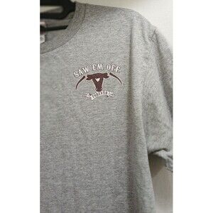Vintage Texas A&M Saw Em Off Forever rivalry t-shirt. Mens size Medium. Gray with maroon graphics on both sides. Front has Saw Em Off Forever longhorn logo, back features large graphic with Bible verse I will cut off the horns of all the wicked Psalms 75:10.