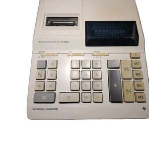 Texas Instruments Model TI-5130 vintage electronic printing calculator. Does not power on — being sold strictly for parts or repair. Cosmetically in decent condition with some signs of age and use. Includes the power cord and a partial paper roll.