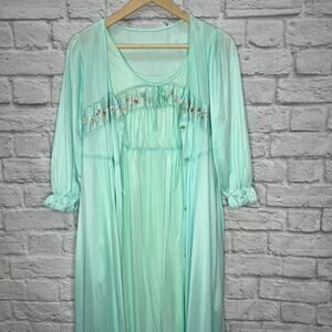 Vintage Texsheen Peignoir Nightgown Set Teal Blue Size M Shiny Long Floral 60/70