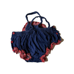 Red floral ruffle trim with matching ruffle on legs and bib front