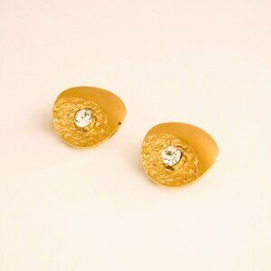 Vintage Textured Clip-On Earrings Gold Tone with Center Rhinestone