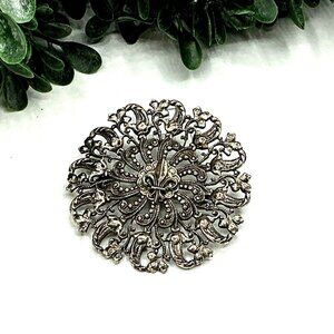 Vintage Textured Filigree Floral Burst Statement Brooch Silver Tone