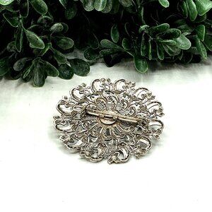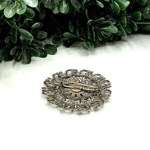 A sophisticated vintage brooch showcasing intricate metalwork with delicate floral design. The elaborate filigree design features a radiant floral burst pattern, creating an elegant accessory that adds refined detail to any ensemble.