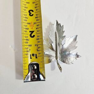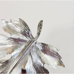 This is a pretty silver tone sugar maple leaf brooch, textured in the middle with intricate carved veins. Accented with small icy clear rhinestones along the stem. Perfect for adding a touch of nature-inspired elegance to any outfit.