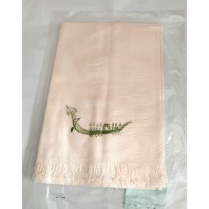 Mid century mission craft towel from Christian Hospital Manorom, Chainat, Thailand. Handwoven cotton with green boat embroidery and fringed edge, made in the hospital’s Leprosy Department program. Unused in original packaging. Measures 10 by 7 inches folded.