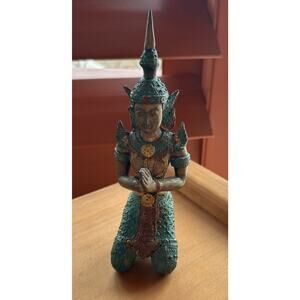 This vintage Thai Guardian Angel Theppanom Buddhist sculpture is a beautiful brass statue that serves as an old amulet. Crafted in Thailand, this unique piece showcases intricate details and vibrant colors, making it a stunning addition to any collection of Asian antiques. The vintage reproduction reflects the rich history and cultural significance of Thai art, making it a valuable and cherished item for collectors and enthusiasts alike.