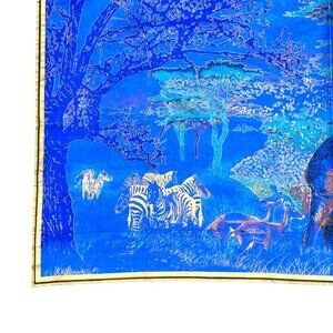 Embrace elegance with this exquisite silk scarf, featuring a vibrant African wildlife scene. Elevate any outfit with its rich hues and luxurious texture. Crafted from 100% Thai silk, this unique accessory promises both style and sophistication. Ideal for adding a touch of exotic charm to your wardrobe.