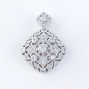 This intricate vintage pendant features a cushion-shaped filigree design studded with sparkling cubic zirconia stones. Crafted in sterling silver, it evokes timeless elegance with a dazzling vintage flair. Ideal for adding a touch of glamour to formal outfits or evening wear.