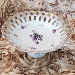 Vintage Thames Handpainted Dainty Violet Pedestal Cutwork Dish Coquette Bridal