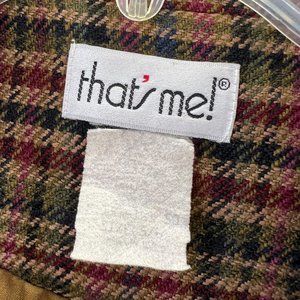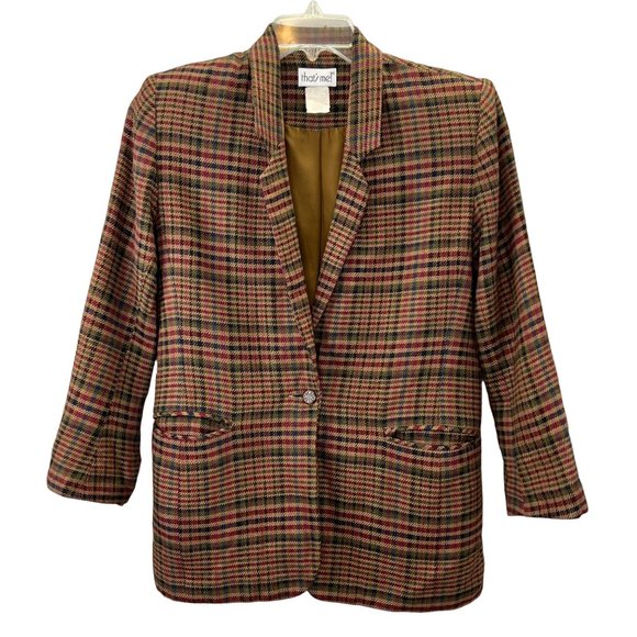 Vintage That's Me blazer in shades of tan, burgundy, olive and blue. Fully lined, pockets, 1 button, good condition. Very hard to read fabric content tag - can barely read size 5/6. Fits like a medium.
