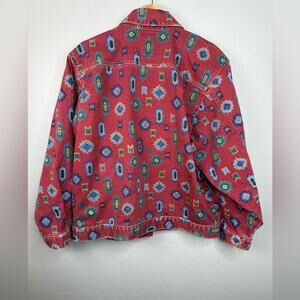 Vintage denim jacket in soft, broken in denim. Red burgundy background with Aztec geo print. Oversized fit. True cool 1990s style with bohemian vibes.