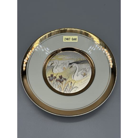 Vintage The Art of Chokin Swans & Flowers 24K Gold Edged Plate 6" Diameter READ