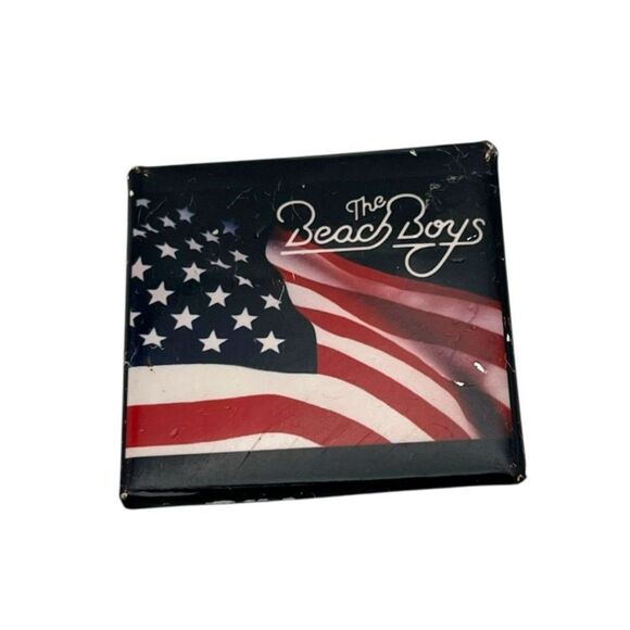 1 pre owned Vintage The Beach Boys American Flag Band Button. This square button features a patriotic flag design with The Beach Boys script logo and appeals to surf rock collectors and fans of classic American music history. Country of manufacture is not marked, release year is most likely late 1980s to 1990s, colors include red white blue and black, and it is made of printed metal with a pinback clasp. Great for Beach Boys collectors and lovers of retro music memorabilia. Pin in great condition with some minor signs of wear, Stored in a smoke free home. Ready to ship! Always down to bundle items together. Feel free to reach out with any questions or offers!