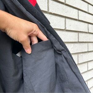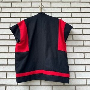 Add a bold, global-inspired layer to your wardrobe with this vintage wool vest jacket by The Daily Planet. Handmade in Nepal from 100% wool, this piece features a striking color block design in black and red, accented with vibrant woven Tibetan-style trim along the front. The open front and cap sleeves offer easy layering, while the hidden interior pocket adds function. Great for festival styling, fall boho looks, or layering over basics for a pop of color and texture. Ethically made and full of artisan character. Tagged size M. Excellent vintage condition.