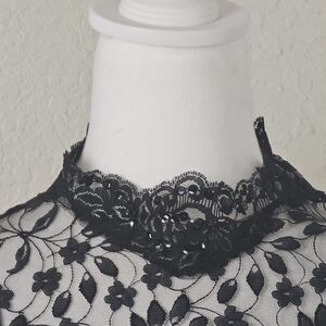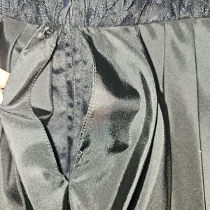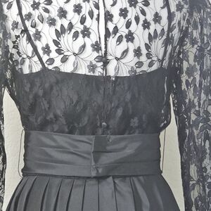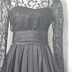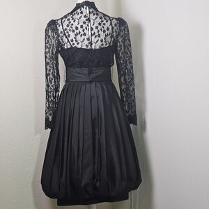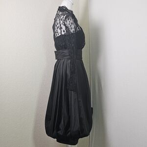 Step into timeless elegance with this stunning vintage cocktail dress by The Gilberts for Tally New York. Featuring a dramatic black floral lace bodice with high scalloped neckline and sheer long sleeves, this dress exudes vintage glamour. The structured pleated taffeta skirt boasts a voluminous bubble hem for added drama, while the wide ruched waistband cinches the waist beautifully for a classic hourglass silhouette.
