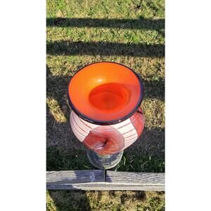 Color/Design: Red and burgundy feathered swirls with white cane-style striping, cased bright orange interior, black lip wrap, and clear pedestal foot
