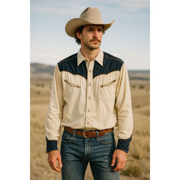 Vintage The J. Peterman Co Ivory Blue Pearl Snap Western Shirt Top Mens Size XL